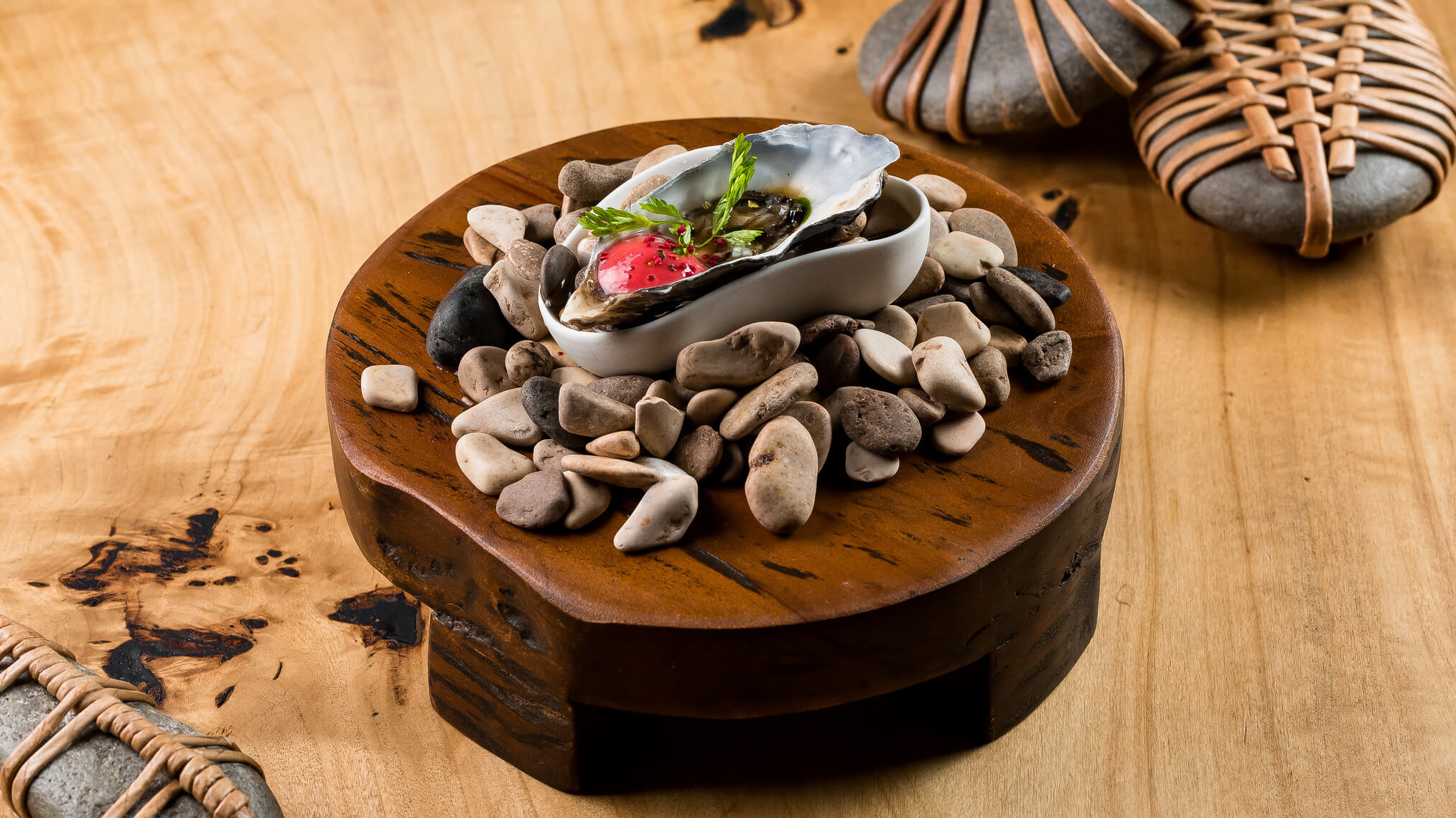 • дальневосточная устрица, забытая малина, масло кервиля, лимонный перец;
