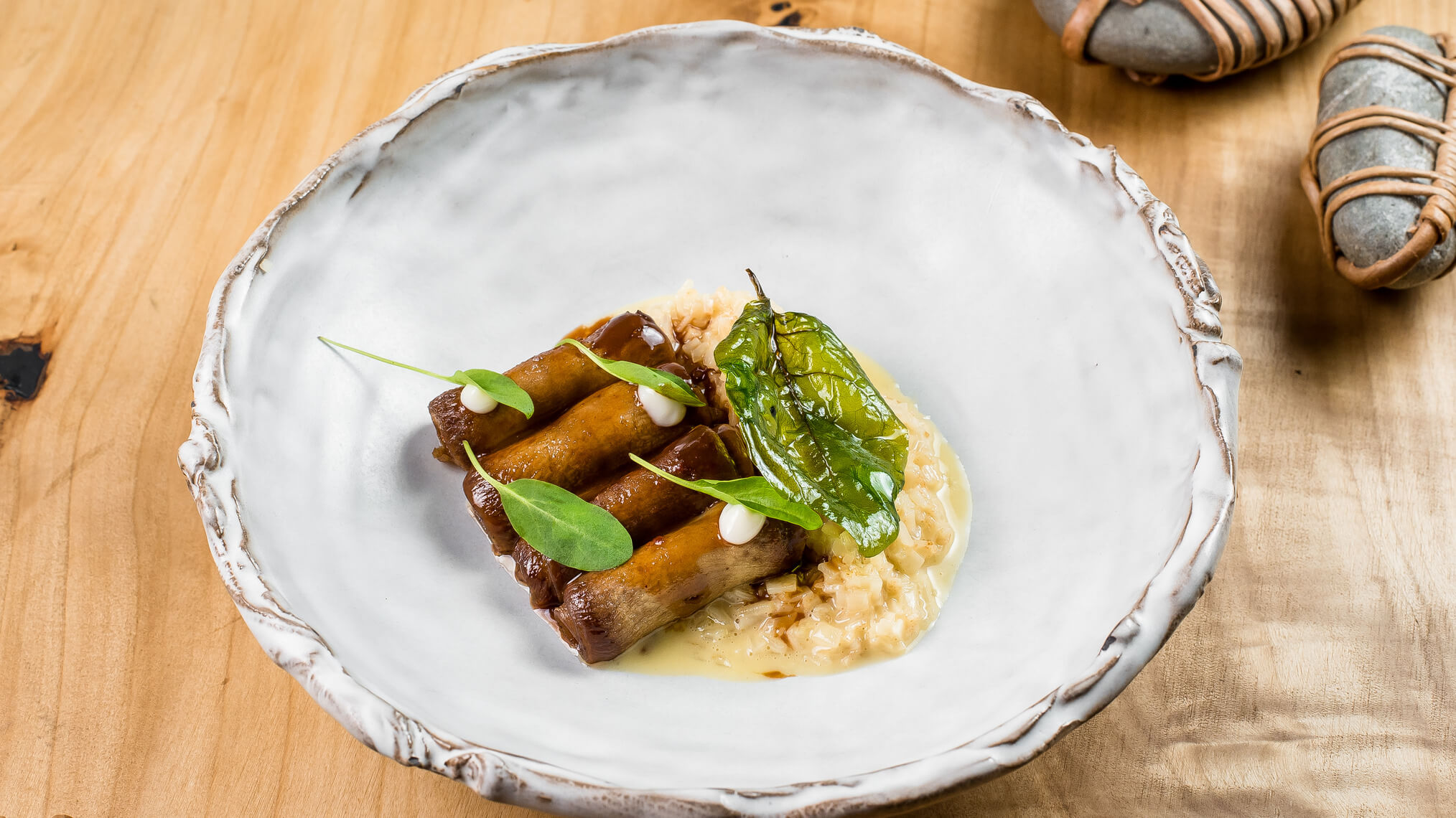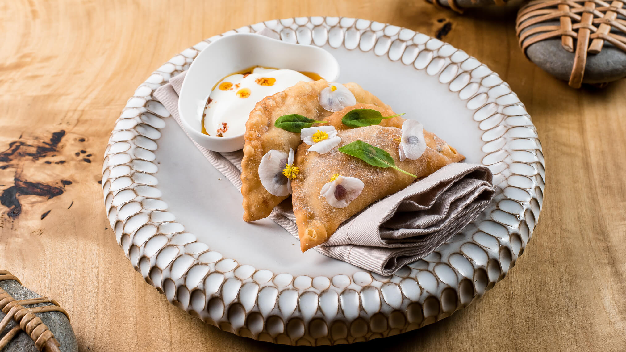 • чебурек с красной курицей, масло из краснодарской аджики, копченая сметана, цедра узбекского лимона, мята;