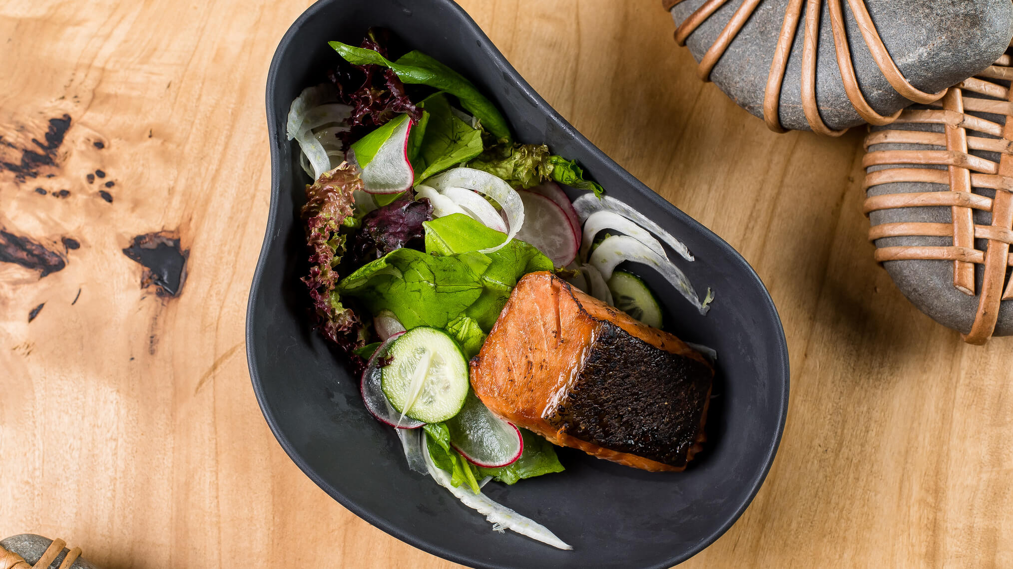• чавыча, квасное сусло на апельсиновых корках, хлеб, свежий салат;